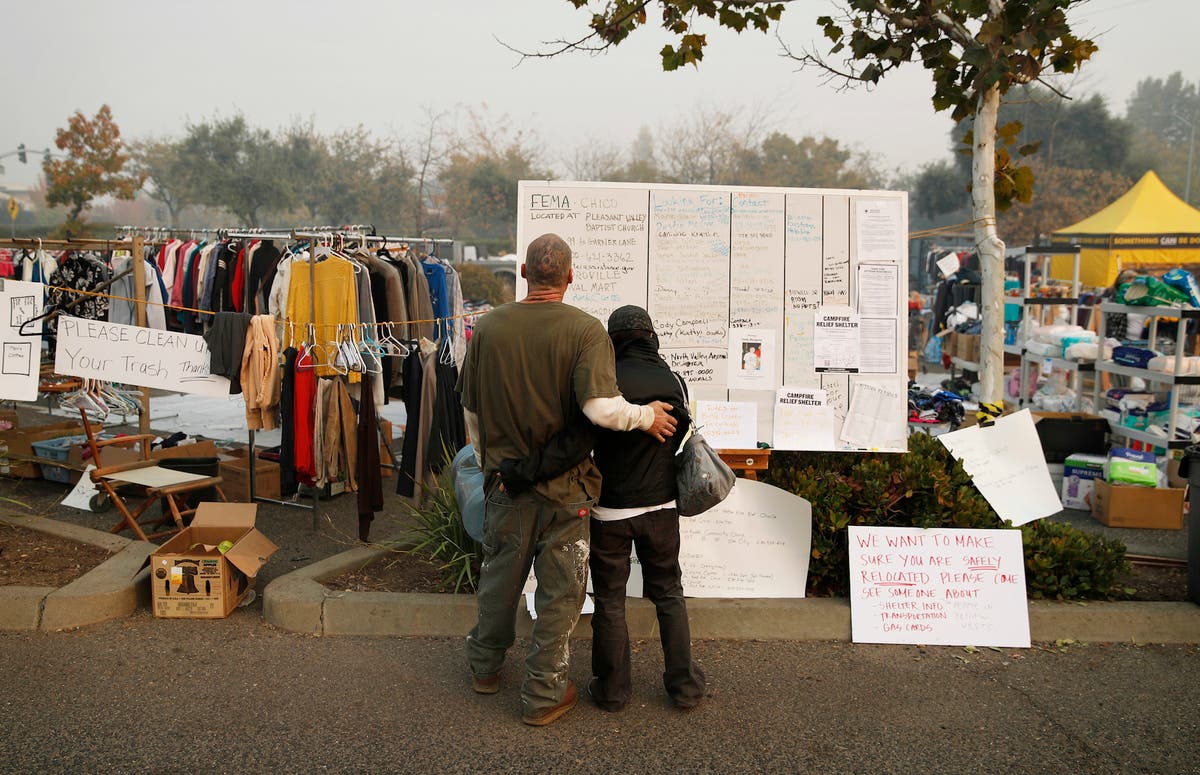 Tera Hickerson, right, and Columbus Holt embrace as they look at a board with information for services at a makeshift encampment outside a Walmart store for people displaced by the Camp Fire in Chico, CA. The two, from Paradise, CA., escaped the fire and don't know if their house is still standing. (AP Photo/John Locher)