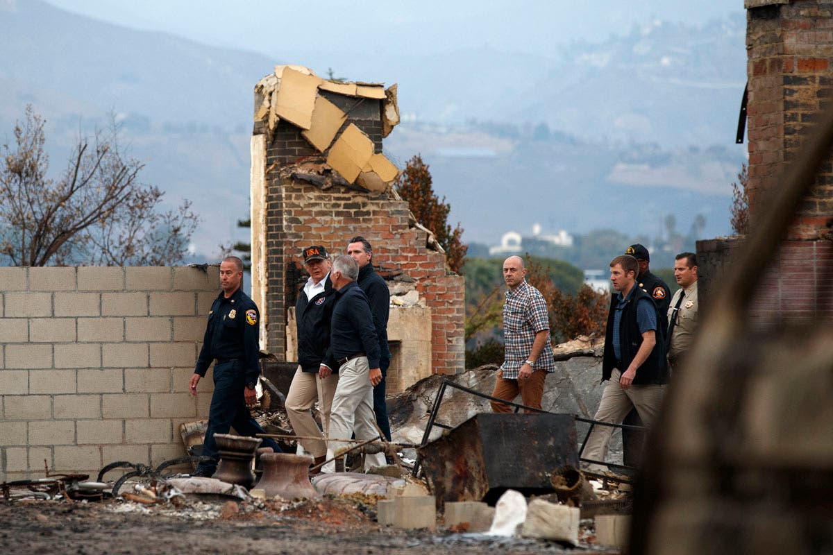 President Donald Trump visits a neighborhood impacted by the Woolsey Fire in Malibu, CA. (AP Photo/Evan Vucci)