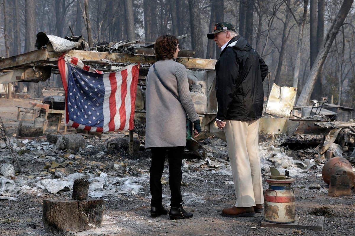 President Donald Trump talks to Mayor Jody Jones as he visits a neighborhood impacted by the wildfires in Paradise, CA. (AP Photo/Evan Vucci)