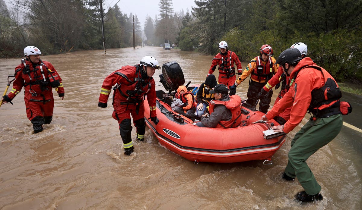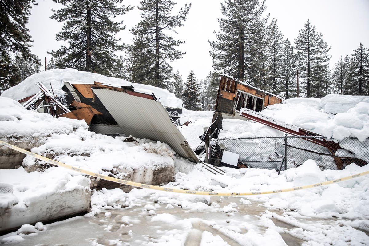 People stand in the parking area of the Alpine Base Area at Palisades Tahoe during a winter storm Friday, February 24, 2023, in Alpine Meadows, California. (AP Photo/John Locher)Snow caps the San Gabriel Mountains above the Rose Bowl Stadium in Pasadena, California on Sunday, February 26, 2023, after a major winter storm swept through the state. (AP Photo / John Antczak)People visit Mount Diablo State Park in Walnut Creek, California on Monday, February 27, 2023. (AP Photo/Godofredo A. Vásquez)Vehicles make their way along Main Street through heavy snowfall in Grass Valley, California on Tuesday, February 28, 2023. (Elias Funez/The Union via AP)Kenny Rybak, 31, shovels snow around his car in Running Springs, California Tuesday, February 28, 2023. (AP Photo/Jae C. Hong)A Joshua tree is covered in snow near the Cajon Pass in Oak Hills, California on Wednesday, March 1, 2023, as a fresh round of snowfall blanketed the San Bernardino Mountains east of Los Angeles. Up to 5 feet of snow fell in some areas, stranding some residents. (AP Photo/Eugene Garcia)Vehicles make their way along the I-15 as clouds pass through the snow-covered mountains near Hesperia, California on Wednesday, March 1, 2023. (AP Photo/Jae C. Hong)A local residents walks his dog in the falling snow on Wednesday, March 1, 2023, in Elizabeth Lake, California just North of Los Angeles. (AP Photo/Marcio Jose Sanchez)State Route 138 winds through snow-covered trees near Hesperia, California on Wednesday, March 1, 2023. (AP Photo/Jae C. Hong)This March 2, 2023, image released by Inyo County Search and Rescue (InyoSAR) shows InyoSAR members searching for a missing person near an area along Death Valley Road, a rough road running south of the 168, and leading into Death Valley National Park, California. (InyoSAR via AP)Snowfall surrounds businesses in Crestline, California on Friday, March 3, 2023, following a huge snowfall that buried homes and businesses. (Watchara Phomicinda/The Orange County Register via AP)Workers clear snow off the roof of Skyforest Elks Lodge after a series of storms on March 8, 2023, in Rimforest, California. (AP Photo/Marcio Jose Sanchez, File)Water flows through a levee breach near the Aromas community in Monterey County, California on Monday, March 13, 2023. The break caused widespread flooding in the Pajaro community nearby. (AP Photo/Noah Berger)Floodwaters surround homes and vehicles in the community of Pajaro in Monterey County, California on March 13, 2023. (AP Photo/Noah Berger, File)Sonoma County Fire District firefighters and a sheriff's deputy pull people in the back of the boat and the driver of a van whose vehicle stalled out in high water on Armstrong Woods Road in Guerneville, California on Tuesday, March 14, 2023. (Kent Porter/The Press Democrat via AP)A bus stop surrounded by snow is seen in Tahoe City, California on Tuesday, March 14, 2023. (Stephen Lam/San Francisco Chronicle via AP)A collapsed building due to the recent snow storms is seen near Dollar Point, California on Tuesday, March 14, 2023. (Stephen Lam/San Francisco Chronicle via AP)A man walks through a windstorm at Ocean Beach on a stormy morning in San Francisco on Tuesday, March 14, 2023. (Gabrielle Lurie/San Francisco Chronicle via AP)Patrick Cerruti assesses damage of his daughter's flooded laundry mat, Pajaro Coin Laundry, on Salinas Road in Pajaro, California on Tuesday, March 14, 2023.(Brontë Wittpenn/San Francisco Chronicle via AP)In this image provided by the Orange County Fire Authority, cliffside homes in San Clemente, California on Wednesday, March 15, 2023, were evacuated due to the landslide in the rear. (Orange County Fire Authority via AP)