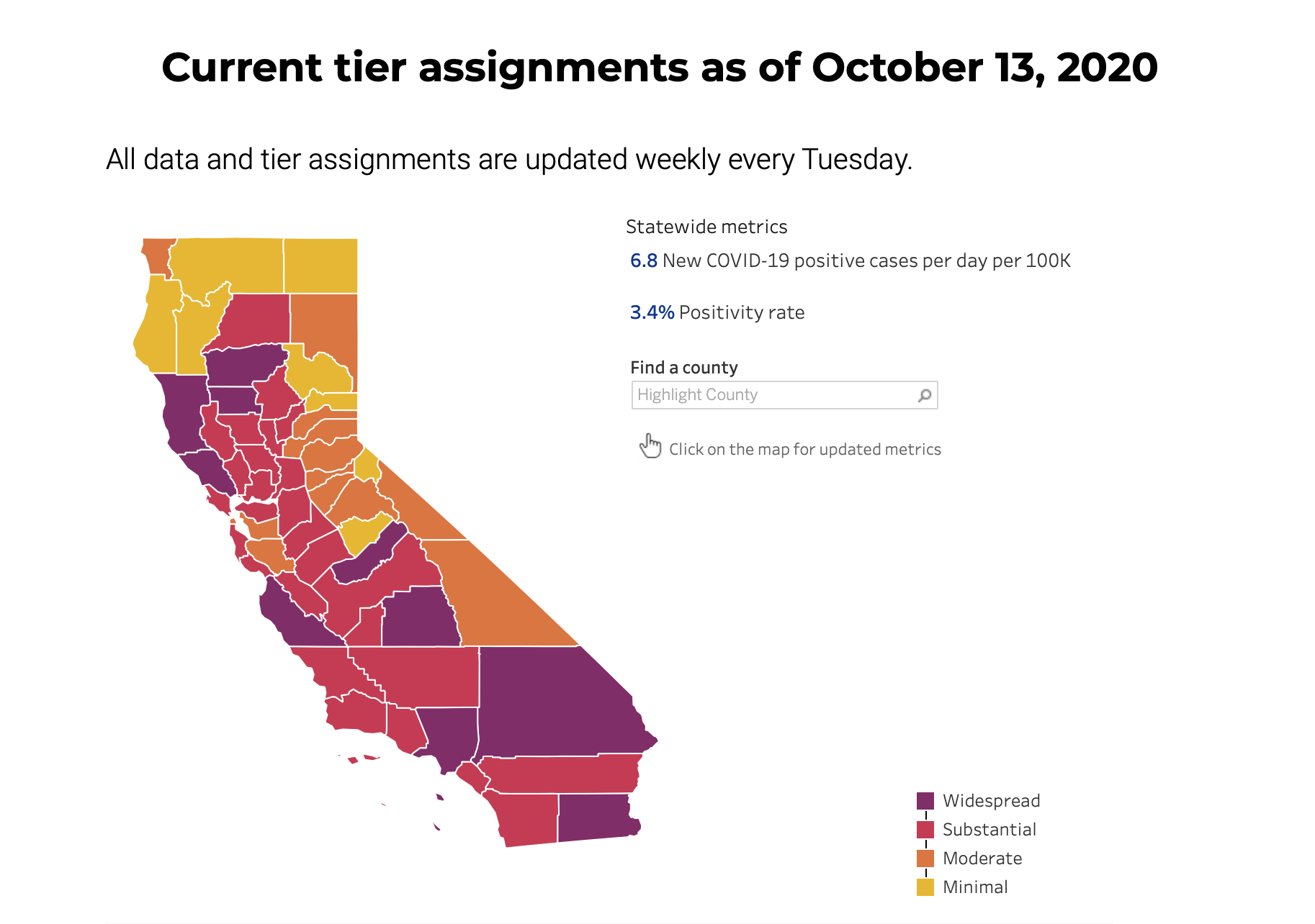 Six counties, Colusa, Kern, Kings, San Benito, Sutter and Stanislaus dropped into the red or substantial tier, and out of the purple or widespread tier.