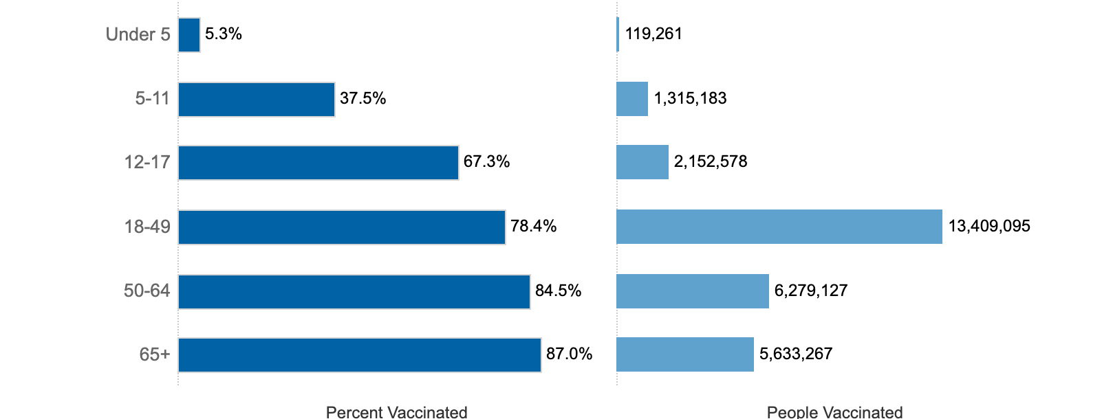 About 38 percent of California children ages 5 to 11 and 67 percent of children 12-17 have received Covid shots, according to the state's public health department. However, COVID-19 vaccine rates among children vary widely across the Golden State. In places such as Marin County, 80 percent of children 5 to 11 have received the shot while some rural counties have vaccination rates below 10 percent for that age group.