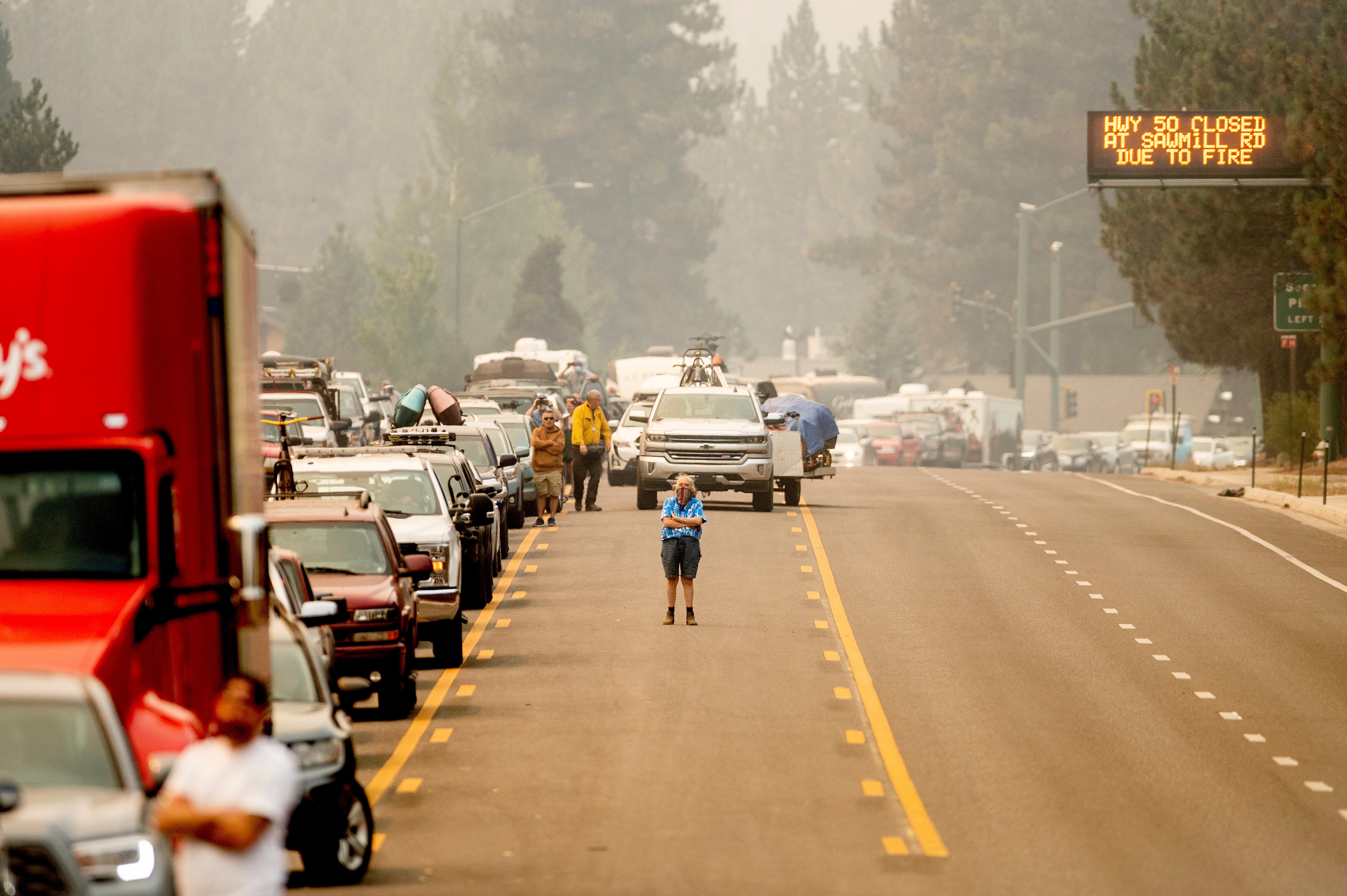 With the Caldor Fire approaching, Dawn Svymbersky stands in the middle of Highway 50 as evacuee traffic stands still in South Lake Tahoe, California.