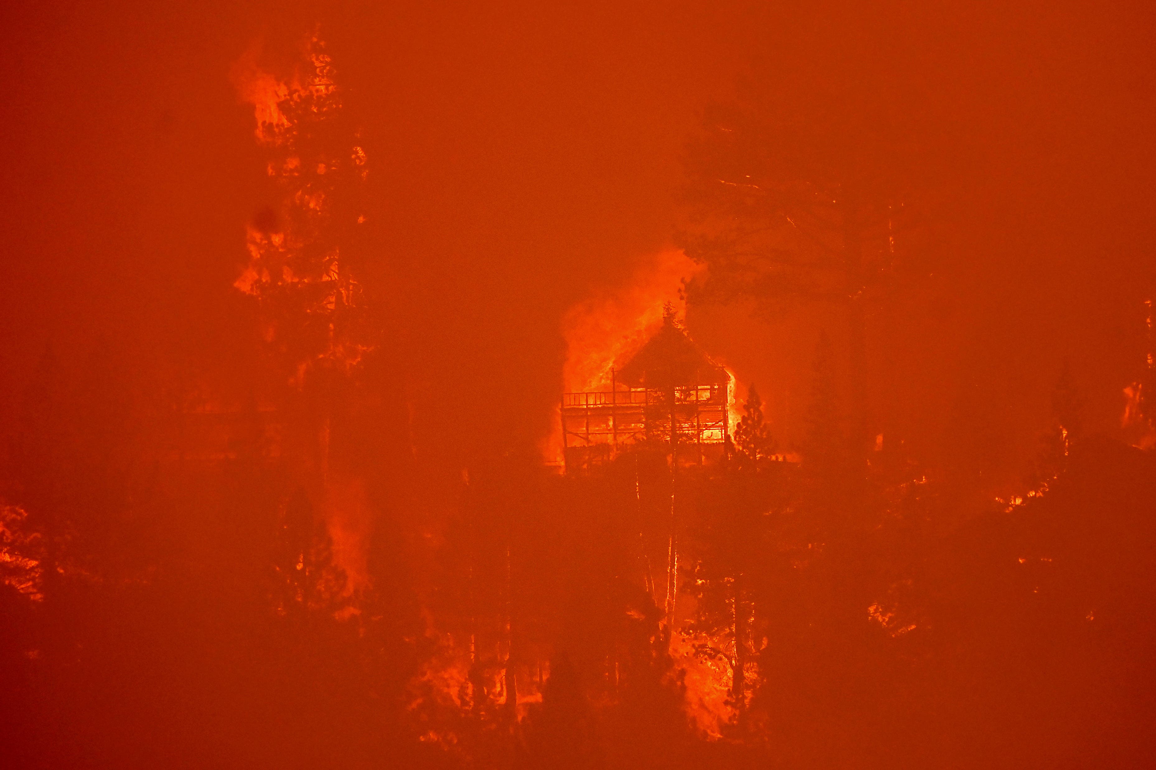 Seen from South Lake Tahoe, California, flames from the Caldor Fire consume a home.