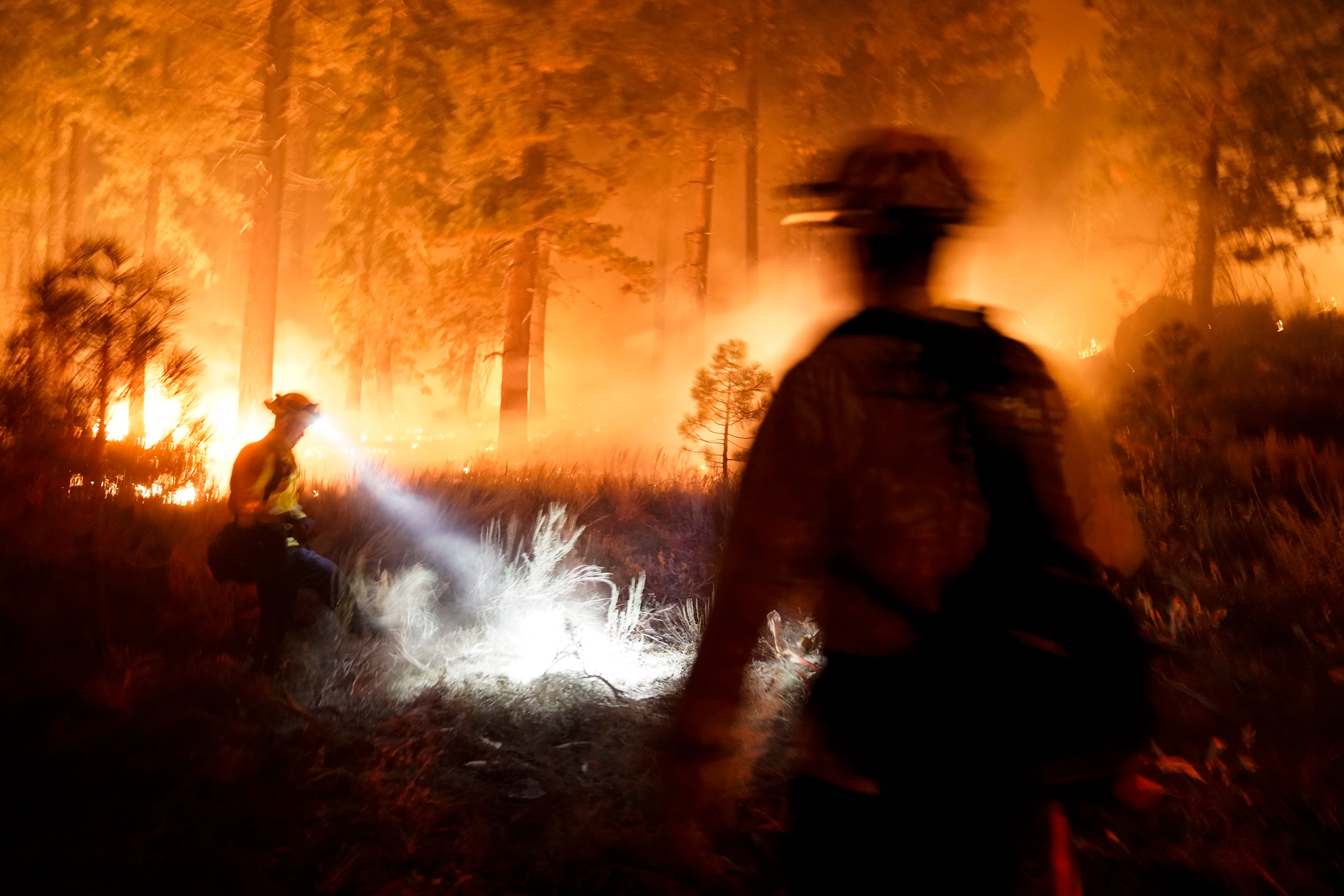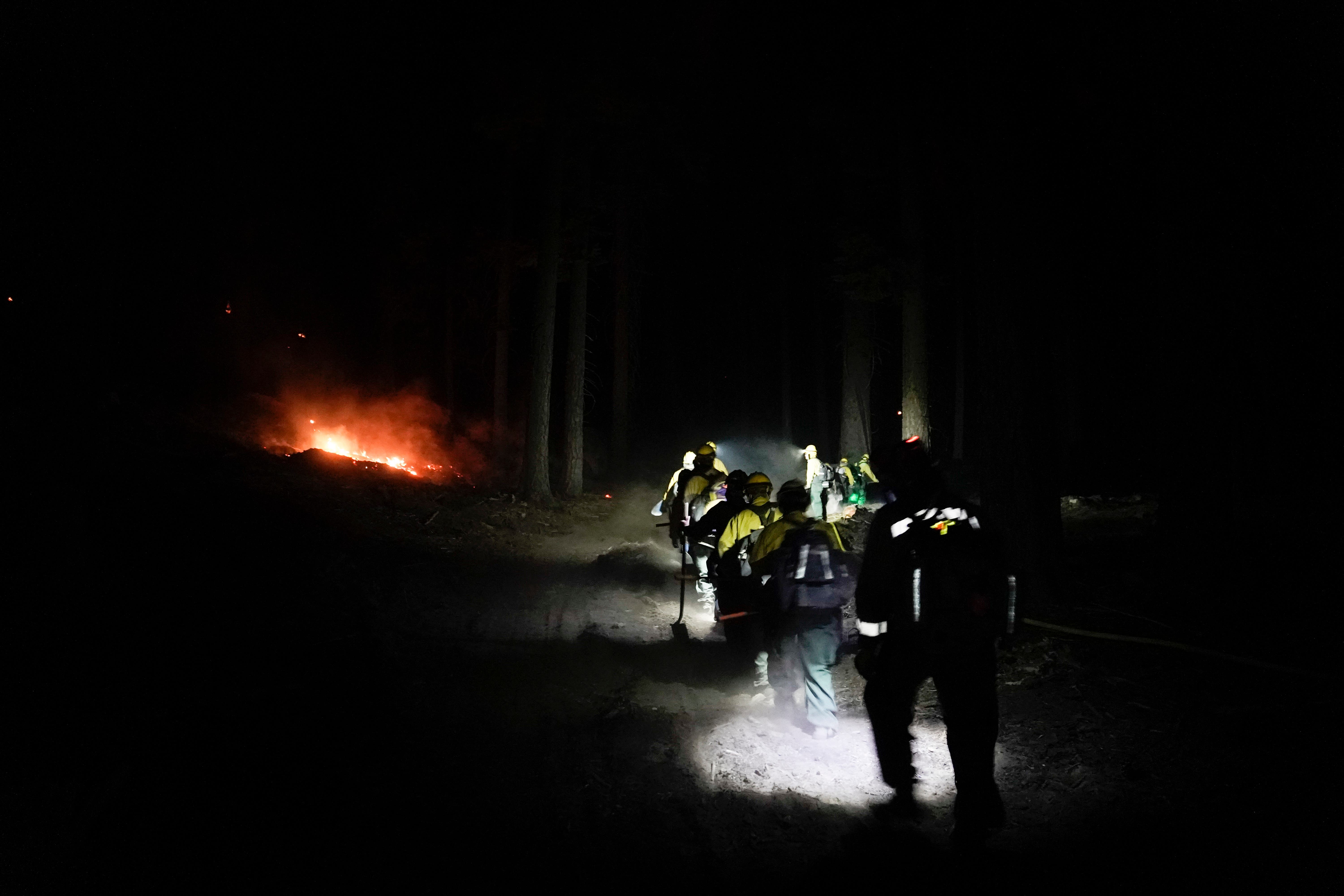 Firefighters walk into the woods to monitor the Caldor Fire burning near South Lake Tahoe, California.