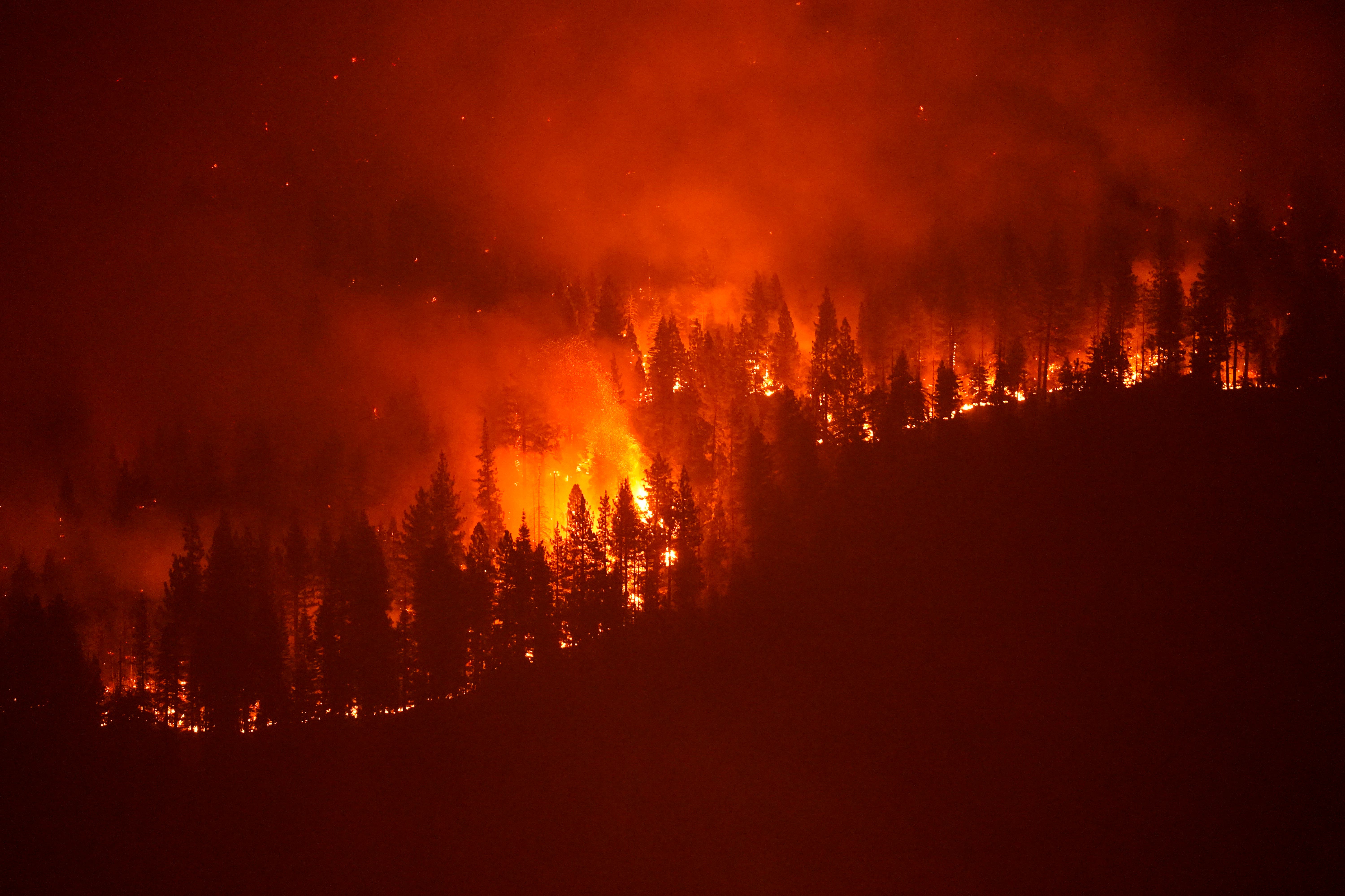 The Caldor Fire consumes trees in South Lake Tahoe, California.