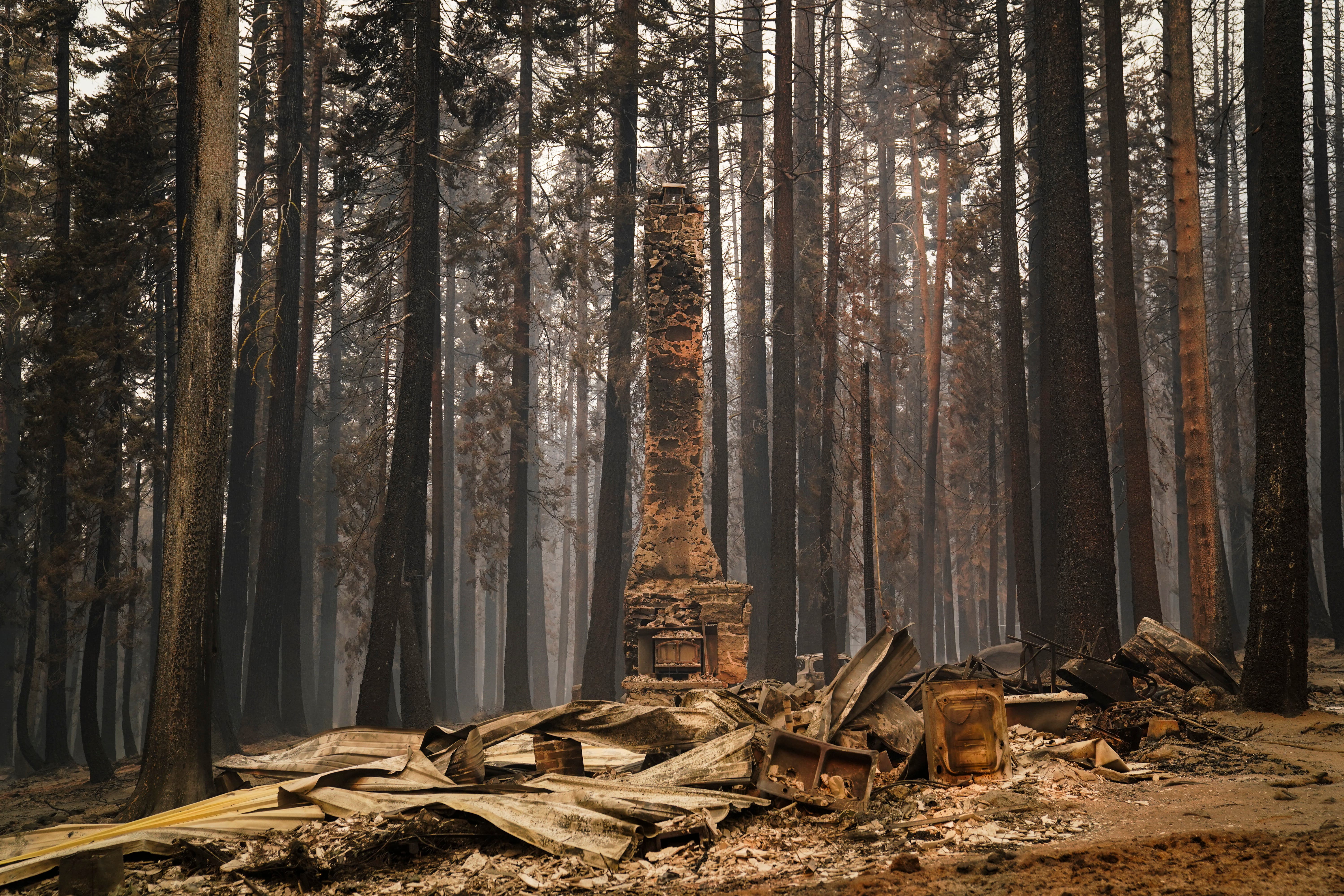A chimney stands on a property destroyed by the Caldor Fire near South Lake Tahoe, California.