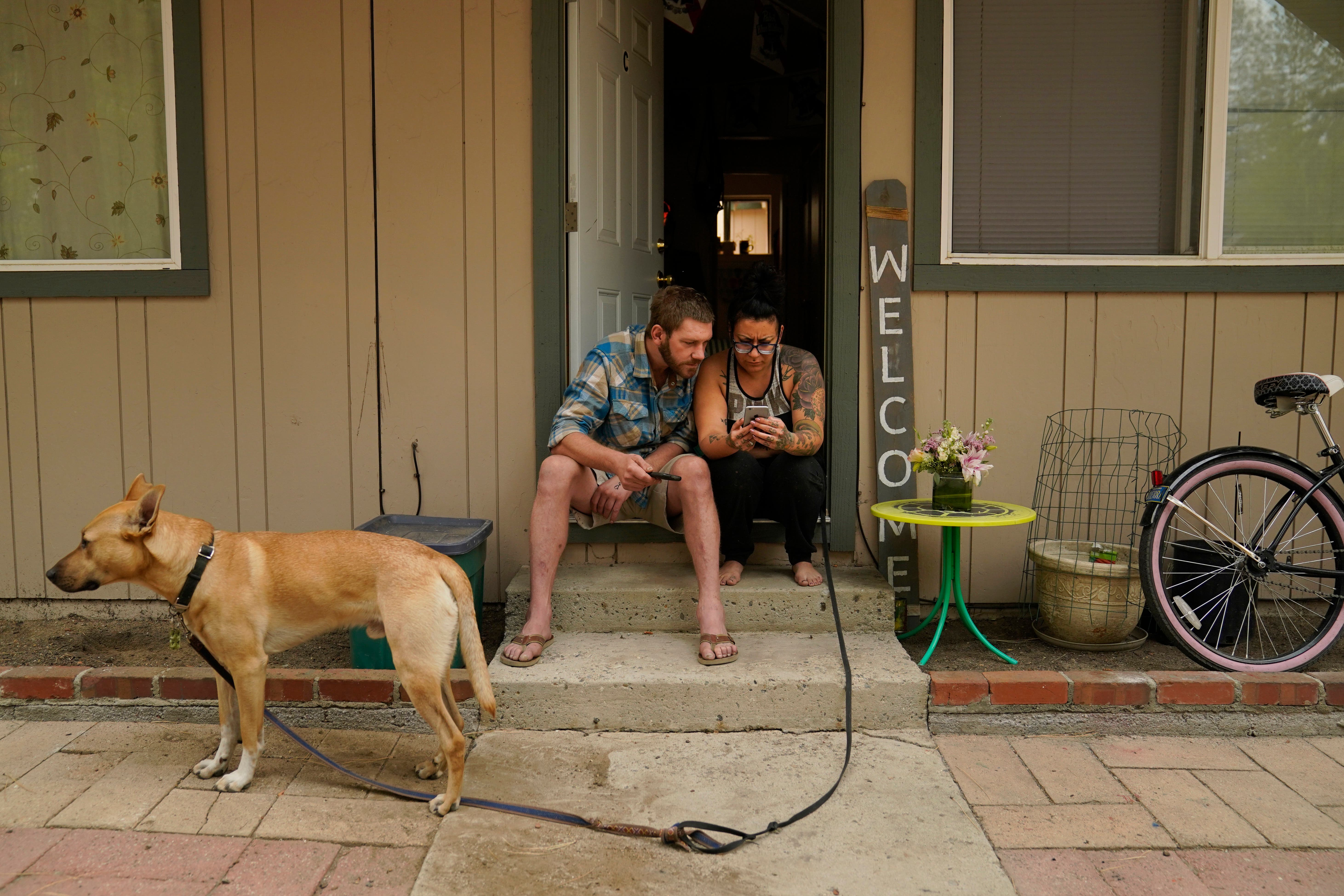 Sierra Fowzer, right, and Skylor Klitsch, a couple who chose not to evacuate, look at their phone for updates on the Caldor Fire in South Lake Tahoe. "This is our home. That is a special reason. This is where we live," said Fowzer.