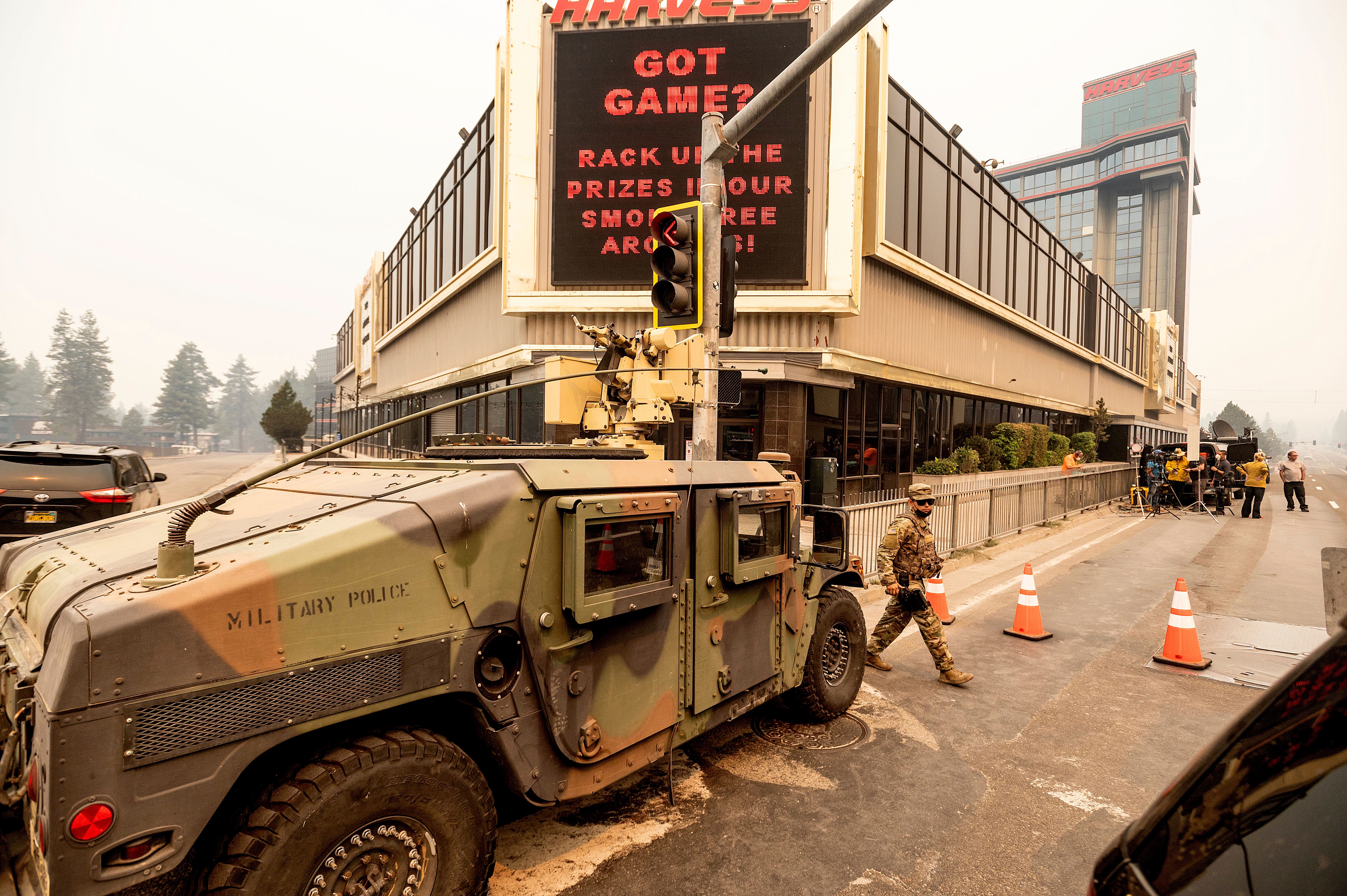 National Guardsmen staff a checkpoint in South Lake Tahoe, California, as the Caldor Fire approaches.