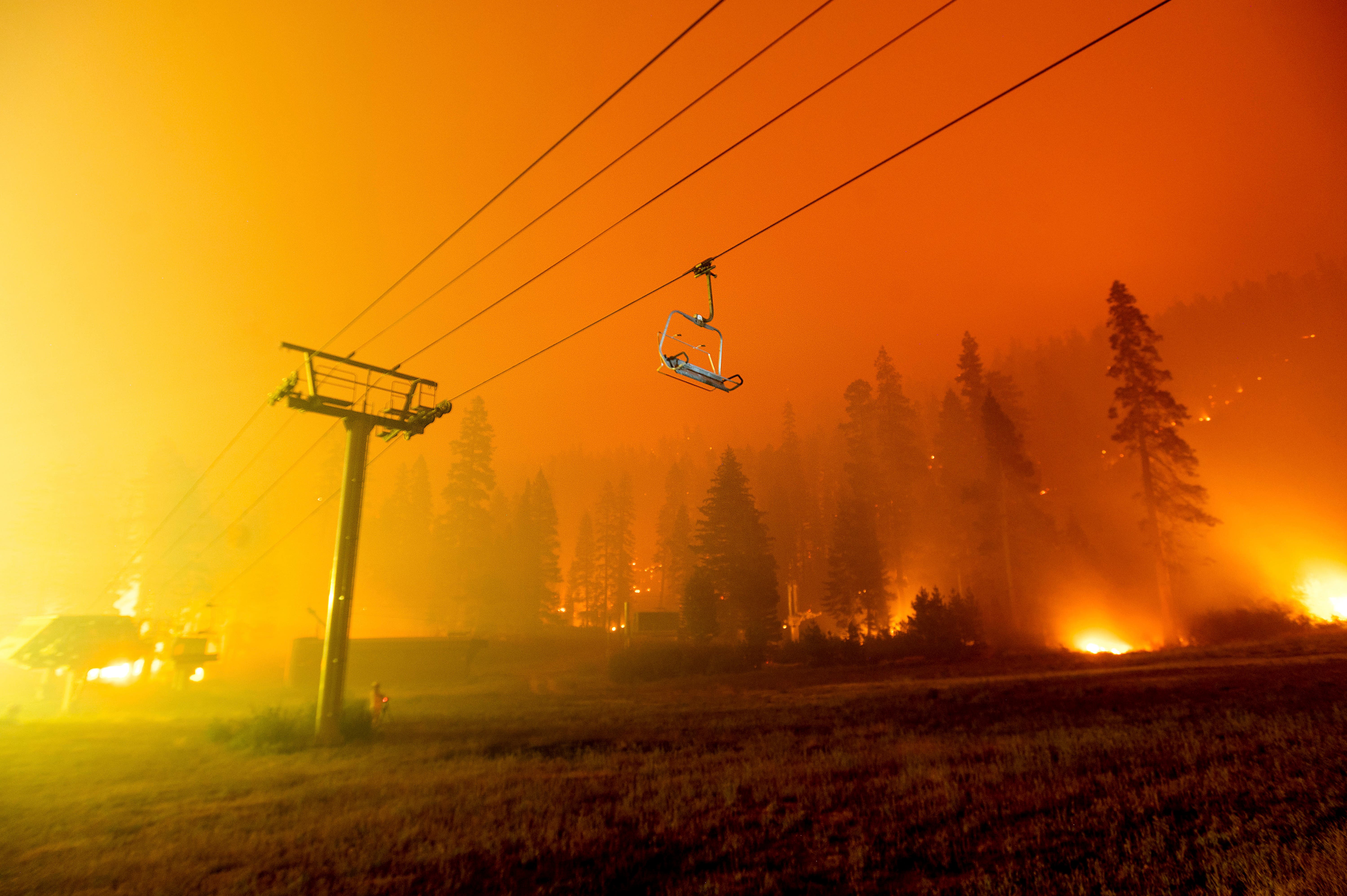 Seen in a long camera exposure, the Caldor Fire burns as a chair lift sits at the Sierra-at-Tahoe ski resort in Eldorado National Forest, California.