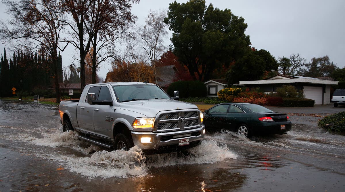 A motorist creates a big splash, due to the rain, while driving through the flooded intersection of Magnolia Boulevard and Laurel Canyon Boulevard in North Hollywood, California. (Mel Melcon/Los Angeles Times via AP)