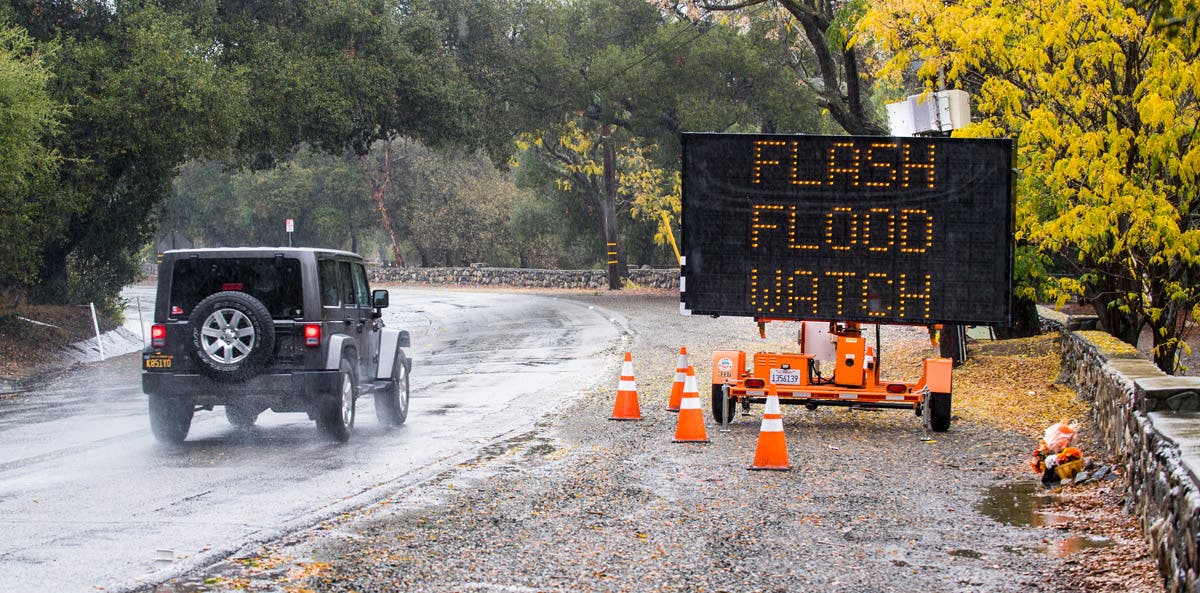 A car passes by a sign warning area residents of a flash flood warning along Trabuco Canyon Road in Trabuco Canyon, California, on Thursday morning as heavy rain and storms moved through Orange County and Southern California. (Mark Rightmire/The Orange County Register via AP)