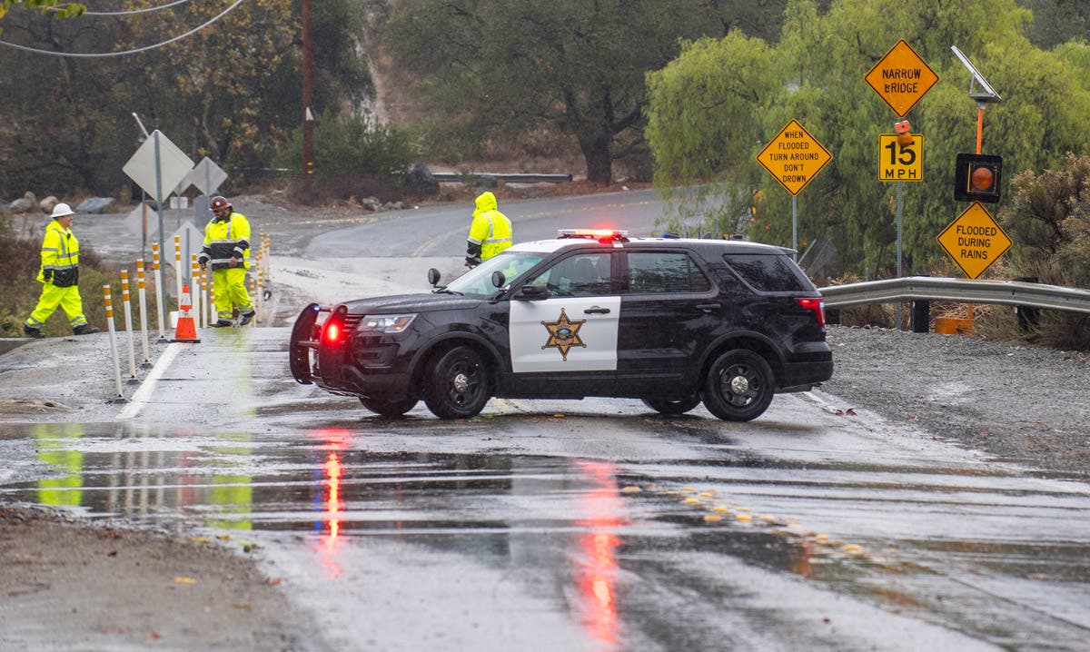 An Orange County Sheriff vehicle closes Trabuco Canyon Road in Trabuco Canyon, California, due to a flash flood warning as heavy rain and storms moved through Orange County and Southern California. (Mark Rightmire/The Orange County Register via AP)