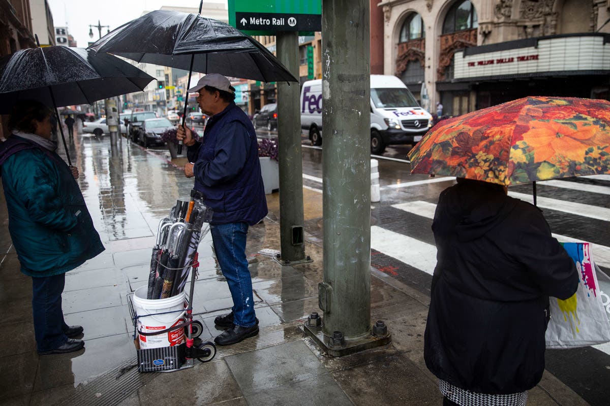 With cloudy skies and rain falling, people walk in downtown Los Angeles. (Kent Nishimura/Los Angeles Times via AP)