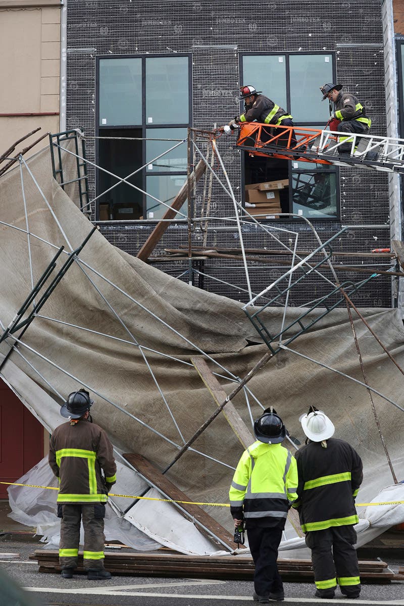 Firefighters remove pieces of scaffolding that were blown down on Taraval Street during stormy weather in San Francisco. (Lea Suzuki/San Francisco Chronicle via AP)