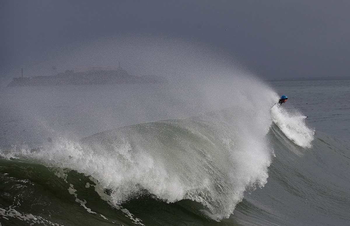 A man surfs near Fort Point in front of Alcatraz Island in San Francisco. (AP Photo/Jeff Chiu)