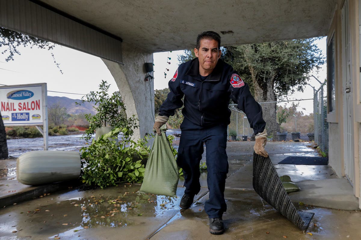 Corona fireman Charlie Apodaca places sand bags at a business to protect it from flooding along Temescal Canyon Road in Corona, California. (Irfan Khan/Los Angeles Times via AP)