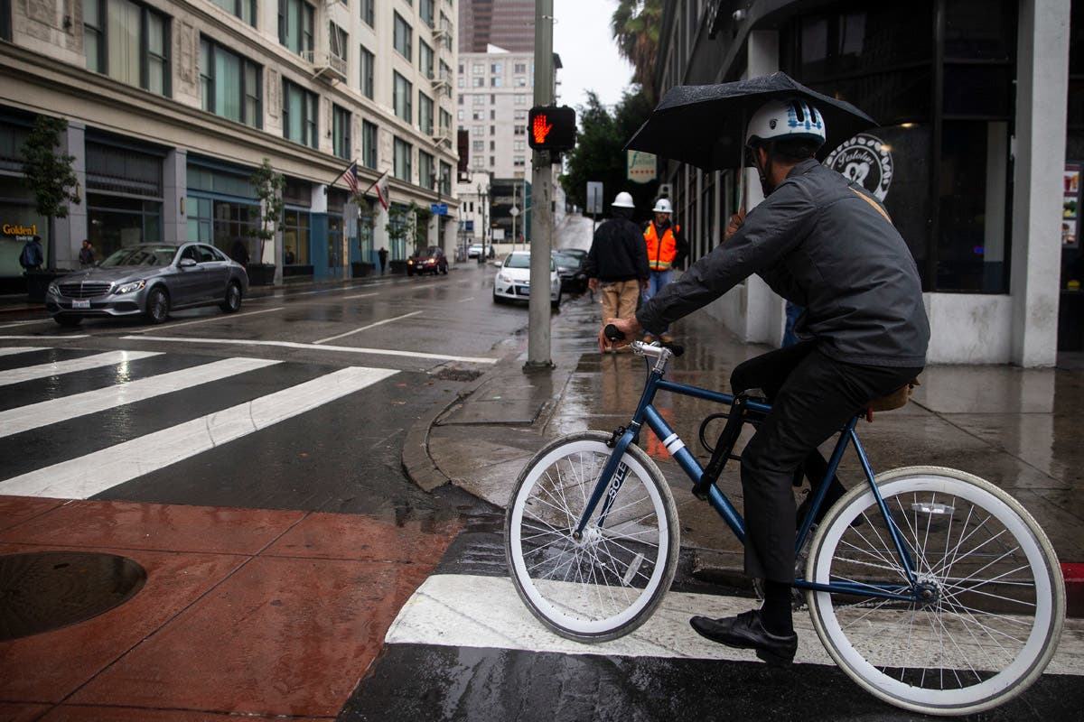 With cloudy skies and rain falling, a bike rider turns off Broadway, as people walk in downtown Los Angeles. (Kent Nishimura/Los Angeles Times via AP)
