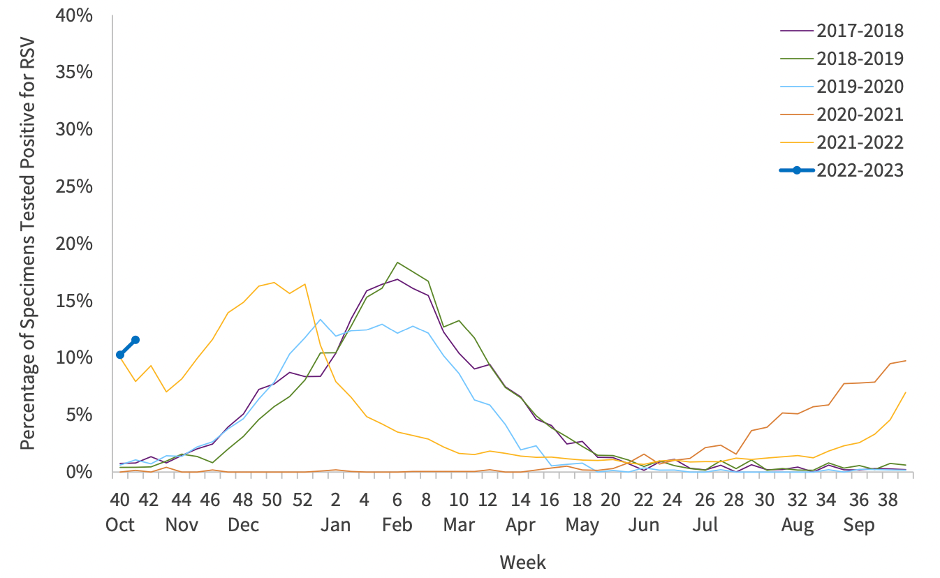 "Although RSV typically circulates during the winter, during the week ending September 24, 2022, 4.7 percent of respiratory illness specimens from surveillance in California tested positive for RSV, a level usually not seen until late November," the Public Health Department reported. "It is unknown how long this increased activity will continue."