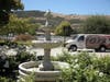 You grab lunch at The Habit and sit outside next to the water fountain.