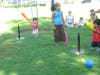 Coach Andy then led us through various activities with the kids. We began by throwing balls through hula-hoops and then running to assorted colored items and standing on them. Still no sign of T-Ball.