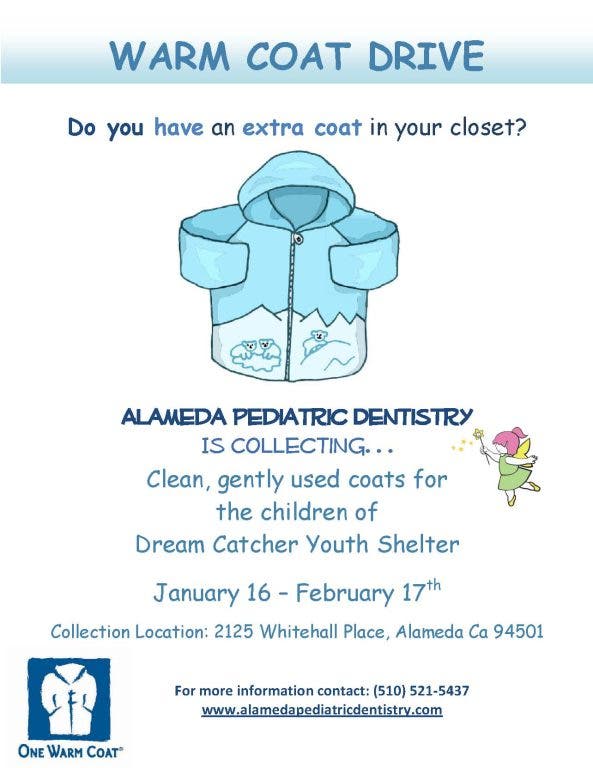Alameda Pediatric Dentistry at Alameda South Shore Center is having a Warm Coat Drive.