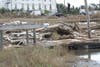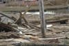 I hit a small fence post, bounce off, and continue straight for the causeway. We look as though we're going to make it but get caught in a hedgerow of debris. The water's over my head here. I get out of the boat 200 yards short of higher ground, and decide to swim for it. I get on on the bow and dive forward with my pell box as a floatation device keeping my Mac out of water. I land belly first and start kicking.