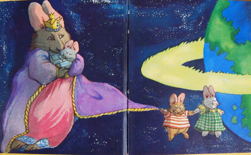 Later that night she lay in bed recalling the cadence in the story, dah da-dah, dah-dah da-dah…, but the exact words alluded her. This led to her rummaging our boxes of stored kids books in the basement (yes, we saved our children’s books). Retrieving the Wells' books, she had me read them to her aloud. Each story involves a bunny child who has some sort of a tough day. In Moss Pillows, it’s a trip to visit obnoxious cousins. First Tomato starts with a rough day at school. A transition then occurs, where in a quiet moment the hapless protagonist recalls the Bunny Planet. At this point comes the refrain my wife couldn’t recall: “Far beyond the moon and stars, twenty light-years south of Mars, spins the gentle Bunny Planet and the Bunny Queen is Janet.” Here the illustration shows the smiling Bunny Queen embracing a forlorn bunny child as she escorts it to the threshold of a large door with a banner over it reading “The Bunny Planet," where Janet enjoins, “Come in. Here’s the day that should have been.”