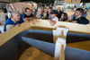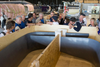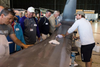 Well, the veil has been lifted today at Artemis Racing in Alameda. Cayard’s Navy hosted a show-and-tell session today which was a never seen before, a behind- the-scenes look at their base in the Old Hanger on Alameda Naval Air Station.