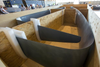 Next we head back to the first floor. A huge box in the middle of the shop floor sits just in front the other massive thing in the hangar. Big Blue Boat 2 is here. She is impressive, she is bulked up, she has huge shoulders now huge massive cross beams, a new addition covered in foil and foam work being done on the huge foil boxes that hold the massive foils that will direct the attitude of these amazing foils.