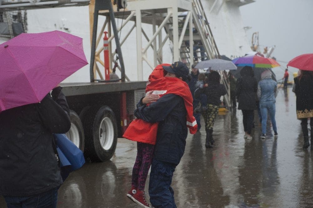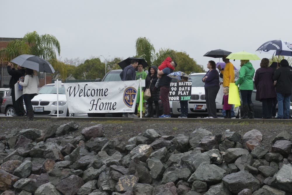 The crew returned at 10 a.m. to a crowd of family members braving the rain, waving signs to welcome them home.
