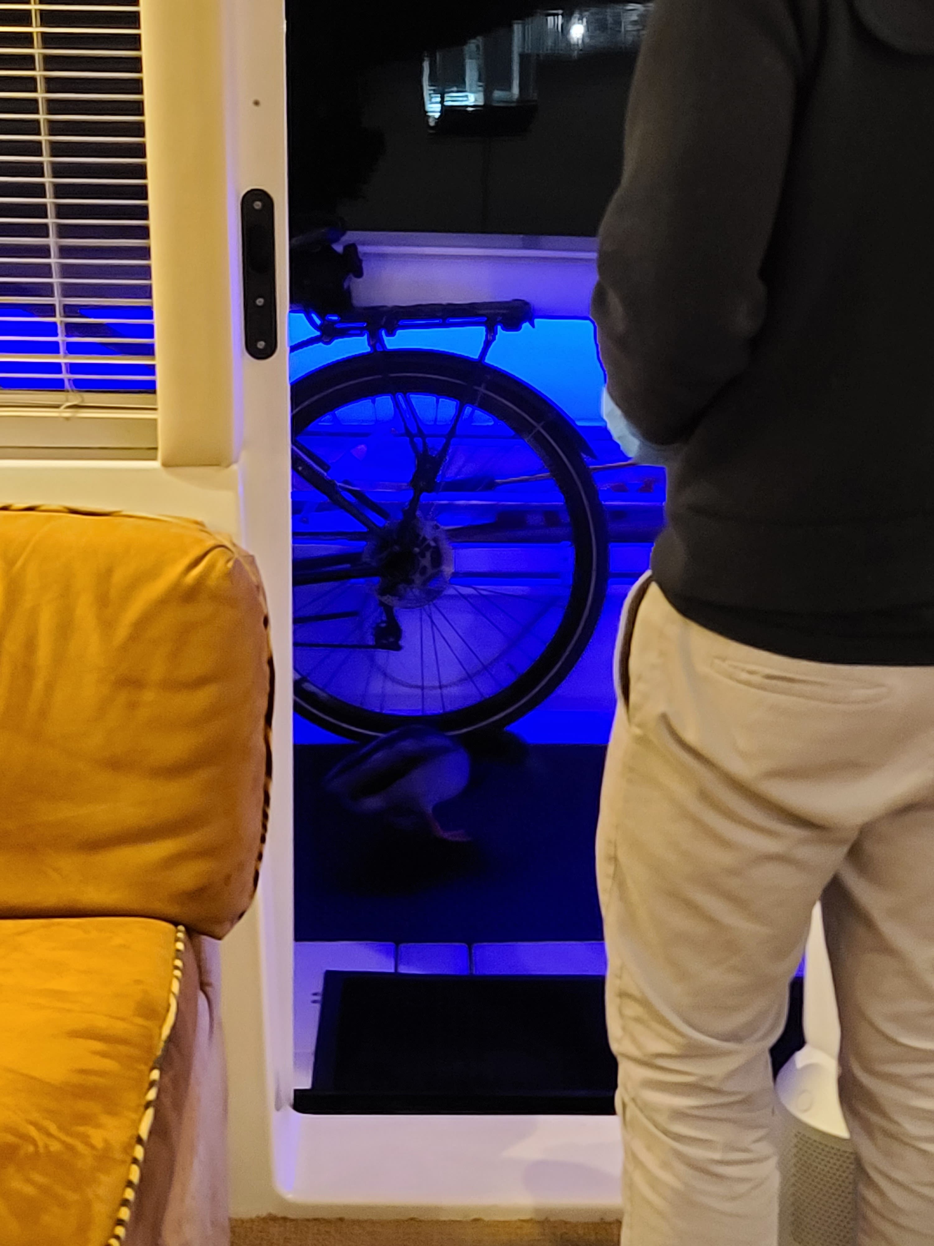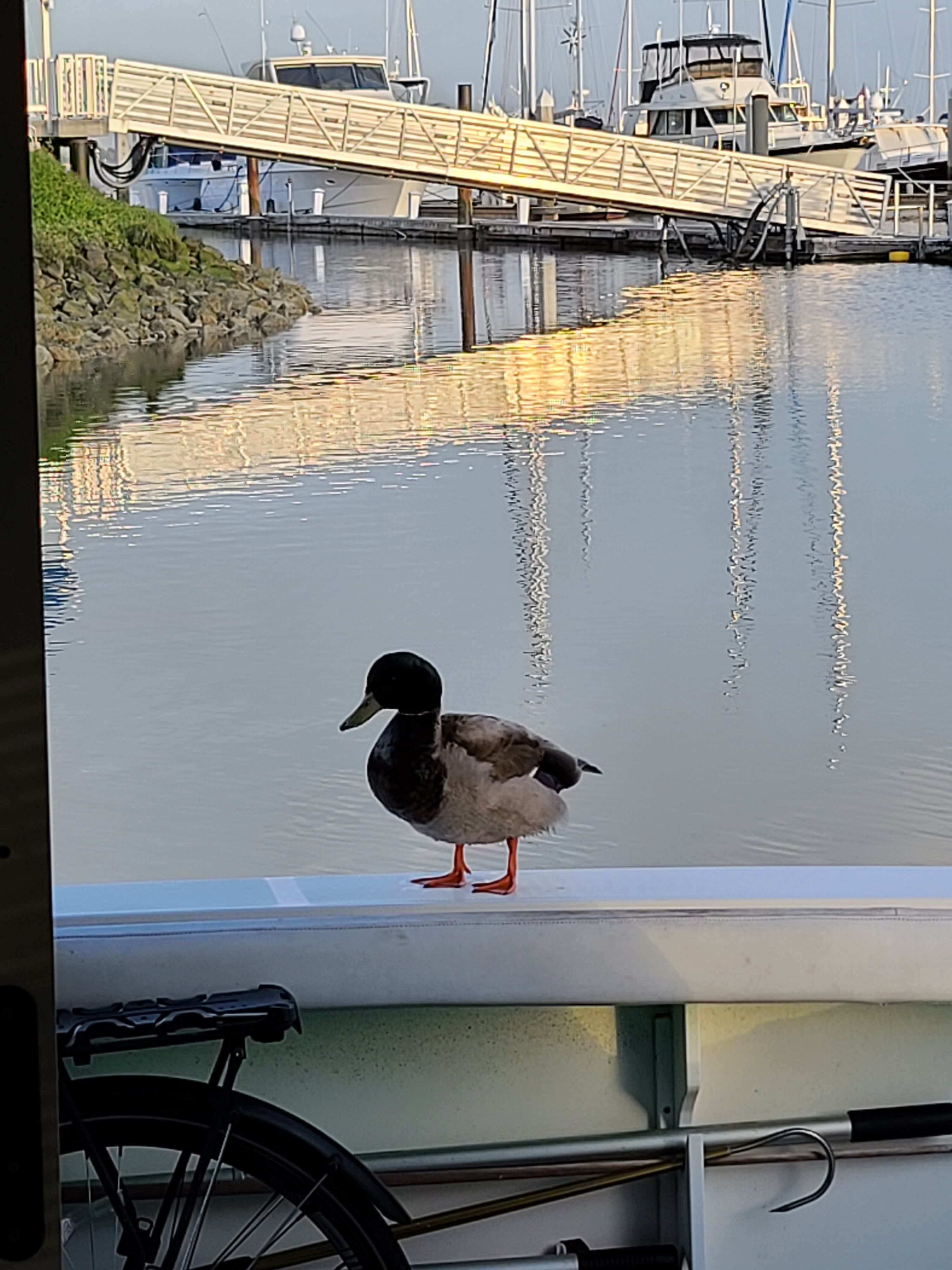"My partner, Andy Harmon and I live on a yacht in West Alameda at Ballena Isle Marina," Nick wrote. "For 2 years now we've had this little runt guy come visit. He eats outta your hand (only healthy duck friendly treats). Taps his bill against the door, sits on our deck and gets so excited to see us he actually peddles (hence the name) with his little feet!