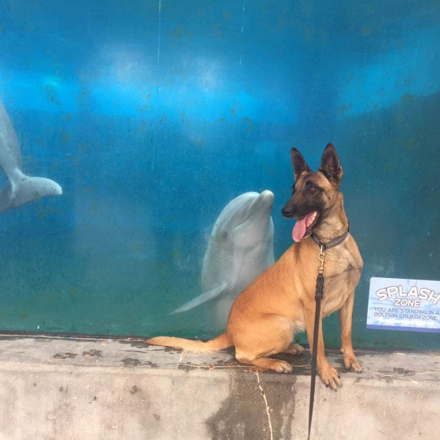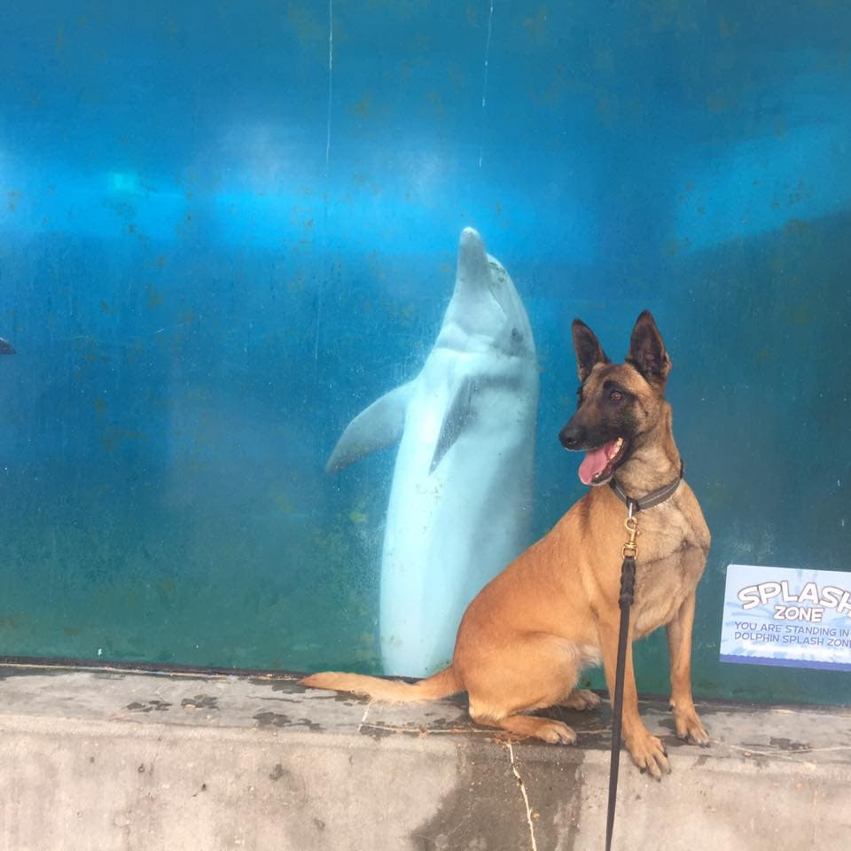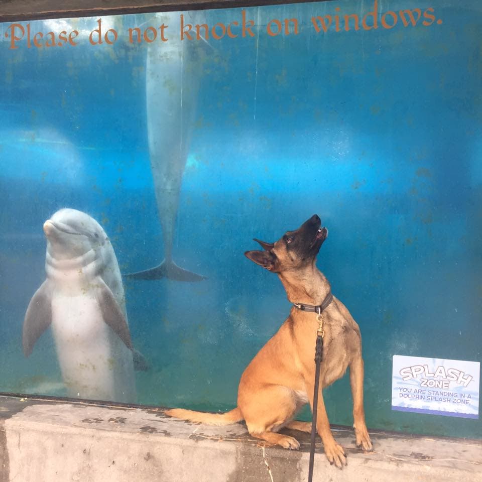 Alameda County Sheriff's Office K-9 Snake visited the amusement park for a training exercise with the U.S. Coast Guard. When he climbed up next to the aquarium tank, dolphins Maddie and Chelsea were excited to see a new creature.