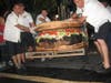 Not only that, but the bun fell apart and the burger didn't flip very well. So this time, Juicy's built a special mold in which to flip the burger — a beef seat belt, if you will. Groups of workers flipped the meat mound every hour, in a riot of barbecue smoke and arms.