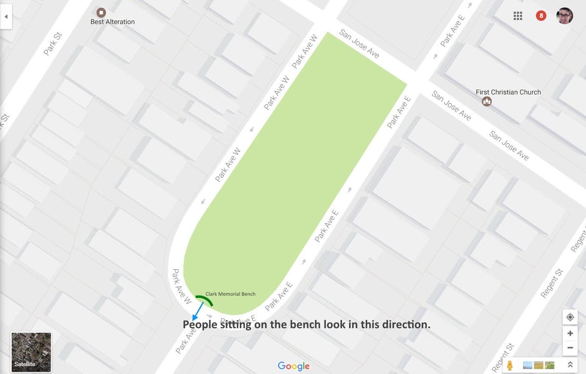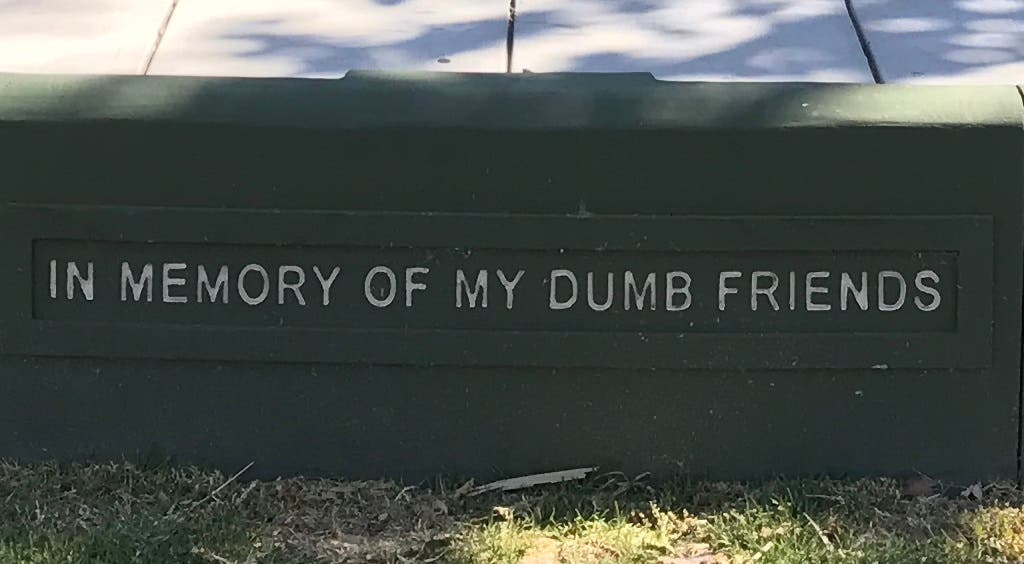 The Clark Memorial Bench has an inscription that reads "In Memory Of My Dumb Friends."