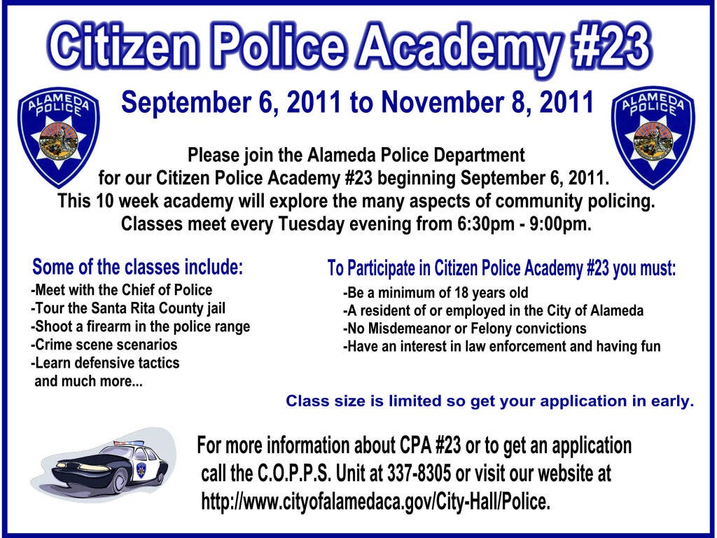 To obtain your application come by the Alameda Police Department or call the C.O.P.P.S. Unit at 510-337-8305. You may also obtain an application from the department's website at www.cityofalamedaca.gov/city-hall/police (click on the Citizen Police Academy link). Class size is limited to 25 participants and applications must be in by Aug. 19.