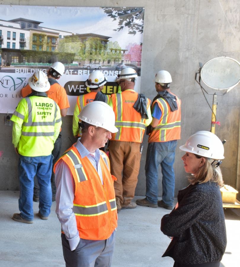 (l-r) W.E. O’Neil President John Finn and Belmont Village CEO Patricia Will talk about Belmont Village Senior Living Albany, scheduled to open fall 2017, while construction workers sign the project banner at the recent topping-out ceremony for the building. Photo by Scott Wall.