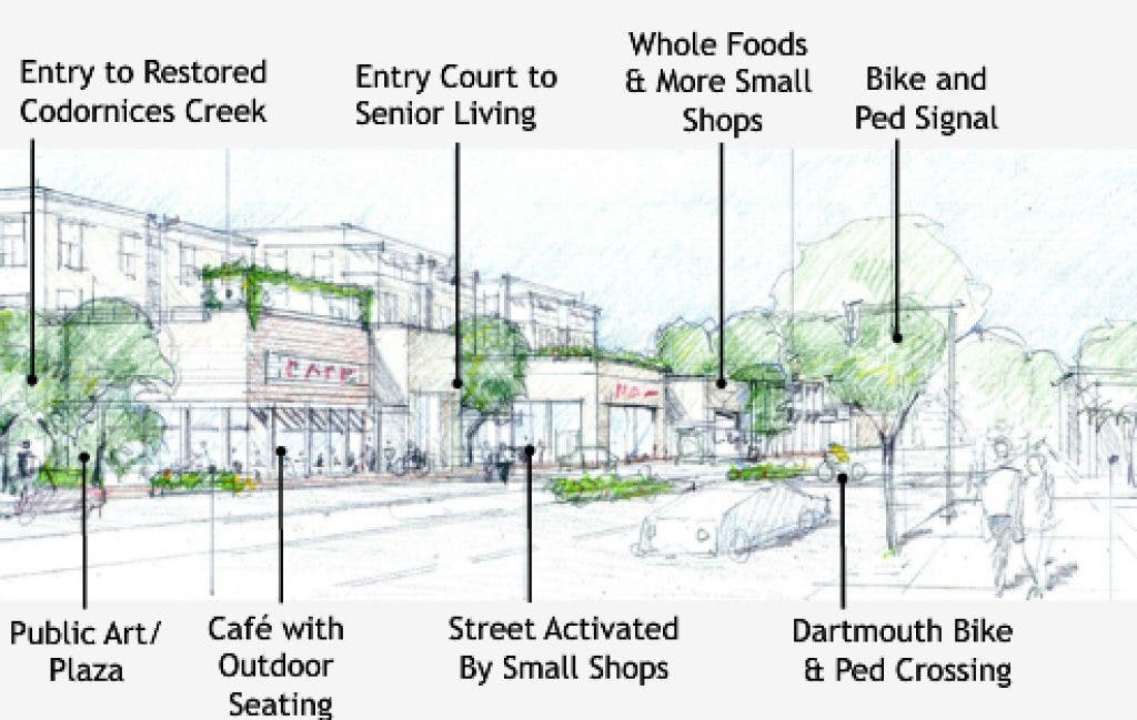 The development is proposed to straddle Monroe Street, west of San Pablo Avenue, with a Whole Foods grocery store to the north and a 175-unit senior housing complex to the south.