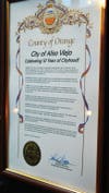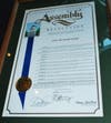 Two framed resolutions were presented to the City of Aliso Viejo. One was signed by Bates, the other was signed by Assembly Members Donald Wagner, Diane Harkey and Mimi Walters.