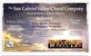 About SGVCC: Founded in 1995, the San Gabriel Valley Choral Company is a non-profit choir based in Monrovia, CA. The Choral Company performs three to four concerts per year, singing a broad repertoire that includes classical, spirituals, pop, jazz, opera, folk music, and musical theater. Comprised of singers from throughout the Southland, the choir provides an opportunity for its members to challenge themselves and to share their love of music with San Gabriel Valley residents. For group ticket sales or to arrange a community outreach performance, please contact choralcompany@gmail.com or 626-579-2433.