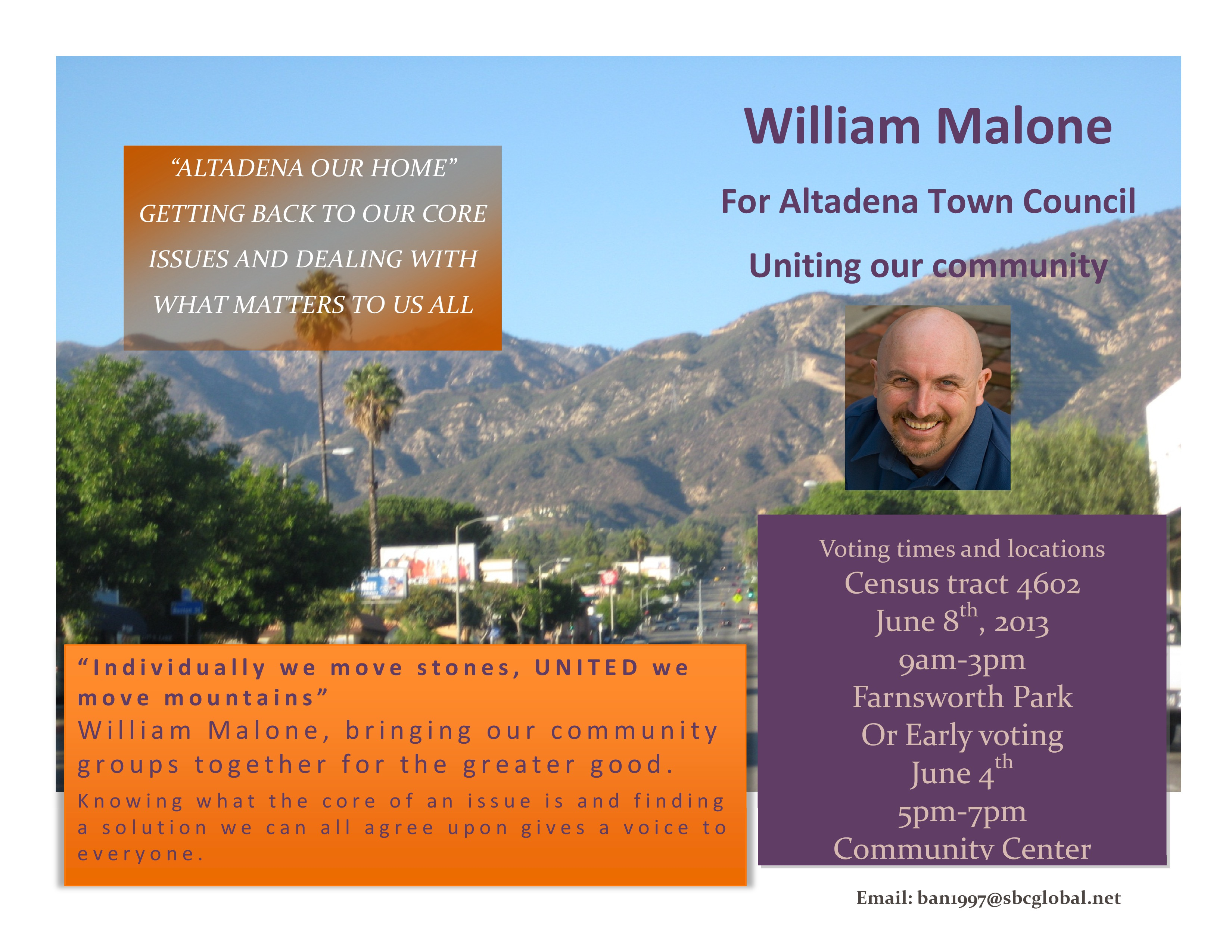 Town Council elections are tomorrow!! If you are in Census Tract 4602, please consider voting for my clever, creative, and hard-working husband, Billy Malone. His platform has been unity and judicious progress. He really has Altadena and its residents' best interests at heart. Thank you!
