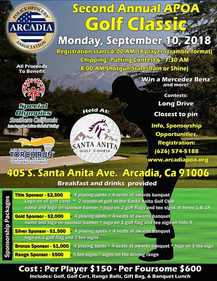 ARCADIA, CA –The Arcadia Police Officer's Association is raising money for Special Olympics Southern California with its second annual golf tournament, set for Monday, Sept. 10 in Arcadia.