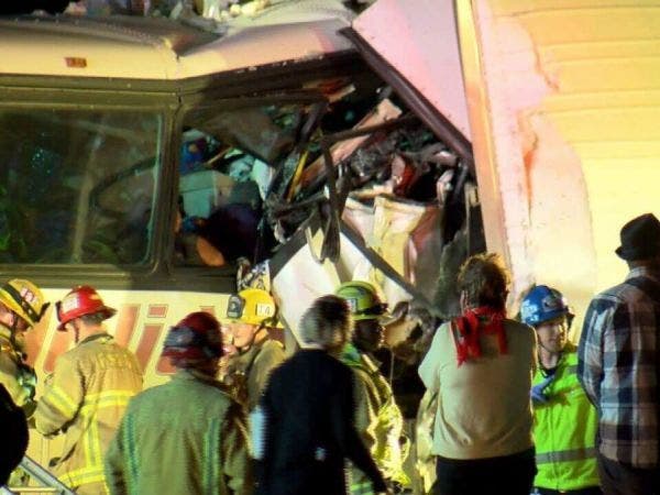 Pictures from the scene showed firefighters using ladders to get into the passenger compartment of the bus, which had been peeled back from the vehicle's undercarriage about one third of its length.