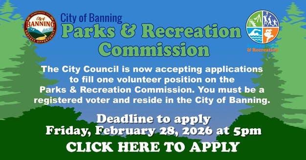 BANNING, CA — The City of Banning is accepting applications to fill one immediate vacancy on the City of Banning Parks & Recreation Commission, according to a recent news release.