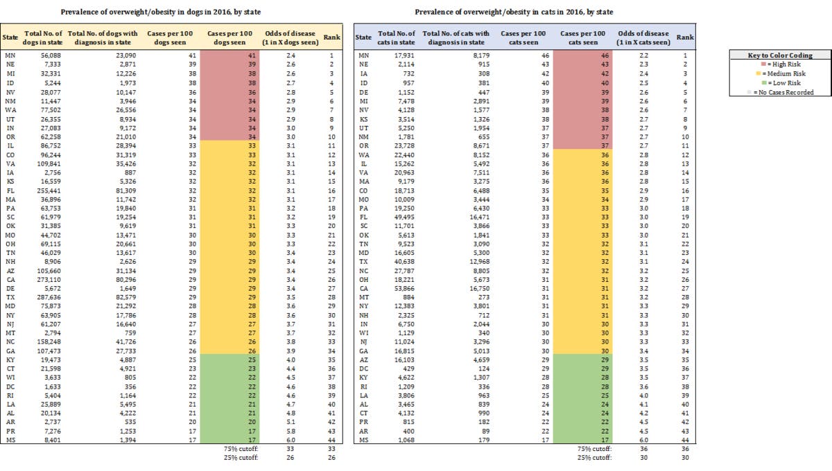 Here are the rankings of the top 10 most obese states for dogs and cats: