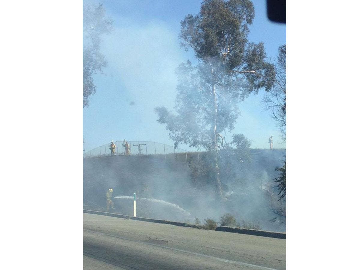 The blaze appeared to be burning in a small patch of trees just south of the roadway.