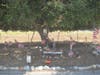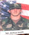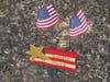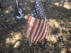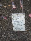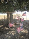 The great oak shades a memorial, filled with flags, stars, stripes, and patriotic ribbons. The small boundary is marked by large rocks, and there are several red, white and blue wooden decorations staked into the ground, with messages and names scrawled across them. Some ask for prayers directed towards specific soldiers, including S. Sgt. Anthony R. Griffith of the 3rd Infantry Mechanized Unit; others request blanket blessings for everyone.