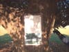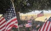 Under a large oak tree, a patriotic memorial is on display.