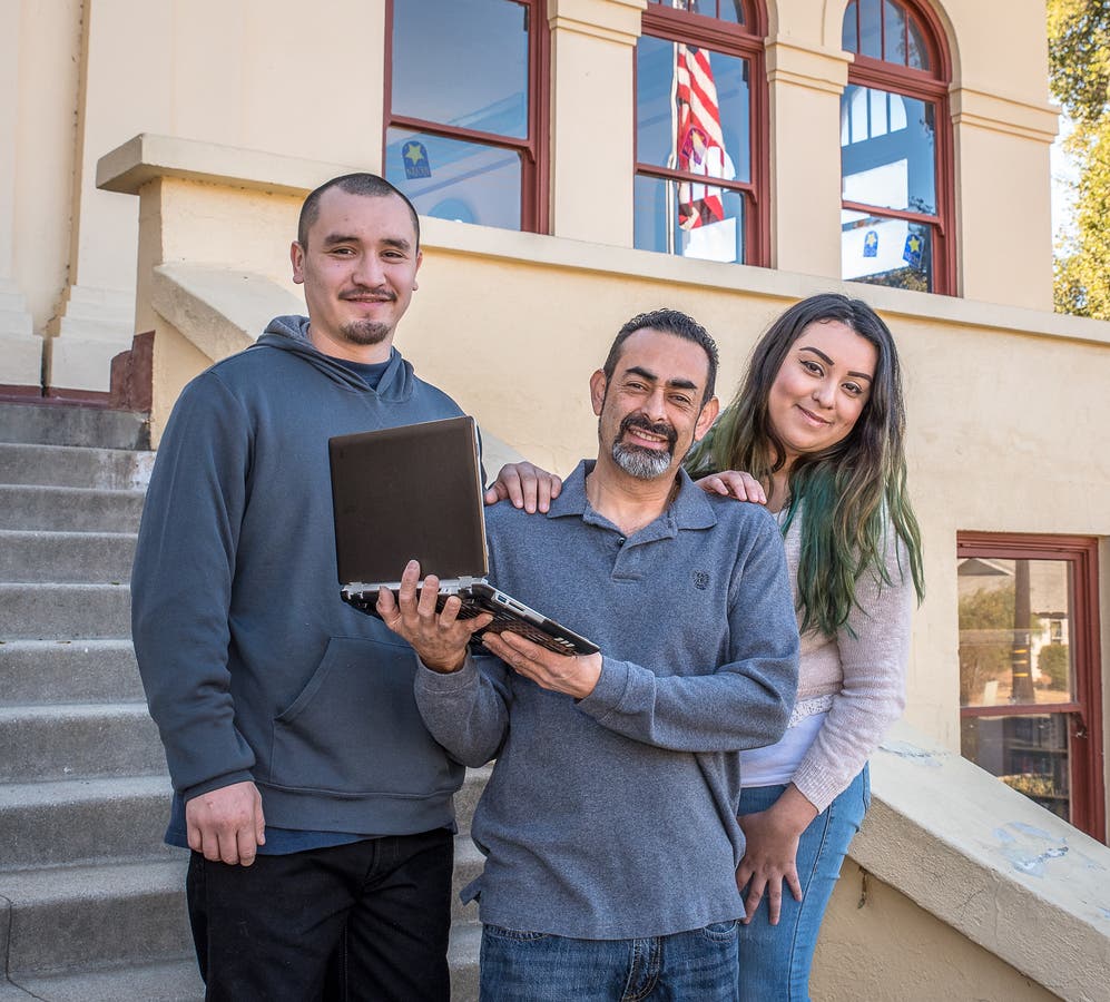 MAIN PHOTO CAPTION: From left, Jesus Fajardo, Edwin Romero, and Alondra De Anda celebrate on the steps of their hometown library. Romero is the Beaumont Library’s first graduate of the Career Online High School program, and Fajardo and De Anda are students. Photo by Alex (Sandy) Mathews-Woodcock