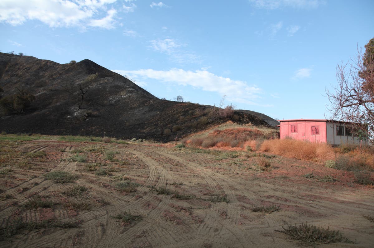 Along Live Oak Canyon Road, a line of red fire retardant was visible Sunday morning. Area houses and cars were blanketed with the stuff — which clearly helped keep several structures from burning down.